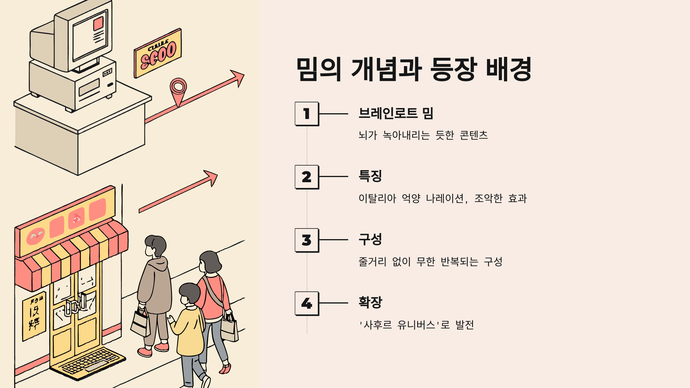 이 밈은 의미 없는 반복, 기괴한 비주얼, 이상한 억양의 나레이션과 조악한 편집 등으로 뇌를 녹이는 듯한 충격을 줘요. 이해보다는 체험과 몰입이 먼저라는 새로운 디지털 문화를 대표하는 현상이죠.