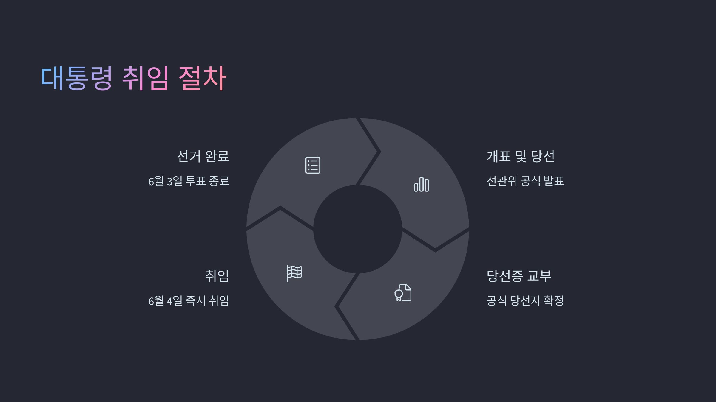 사전투표는 5월 29일(목)부터 5월 30일(금)까지 이틀간 진행되며, 본투표는 6월 3일(화) 단 하루, 오전 6시부터 오후 8시까지 진행돼요. 전국 투표소에서 동시다발적으로 이뤄지며, 당선자는 투표 다음 날인 6월 4일에 바로 대통령직에 취임하게 돼요. 조기 대선이라는 특수성으로 인해 인수위 없이 곧바로 임기를 시작하는 셈이죠. 이 점도 이번 선거가 갖는 독특한 특징이에요.