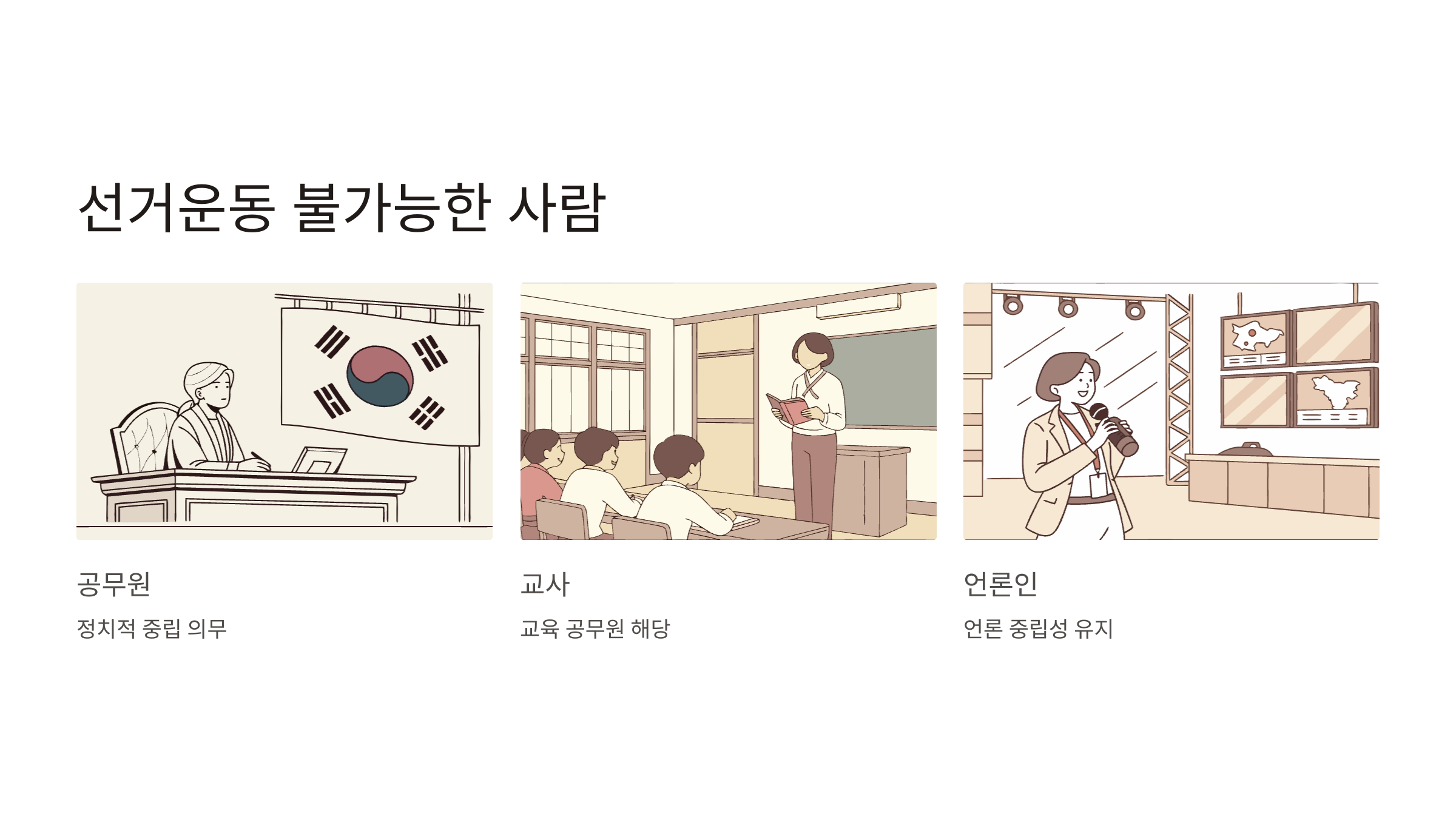 공무원, 교사, 언론인은 정치적 중립을 위해 선거운동이 금지돼 있어요. 예외적으로 정당 가입과 투표는 가능하지만, 특정 후보를 지지하는 표현은 금지된답니다.선거운동에 참여하려는 분들은 자신의 자격 요건과 법적 지위부터 확인하는 게 좋아요. 불법 선거운동은 처벌로 이어질 수 있기 때문이죠.