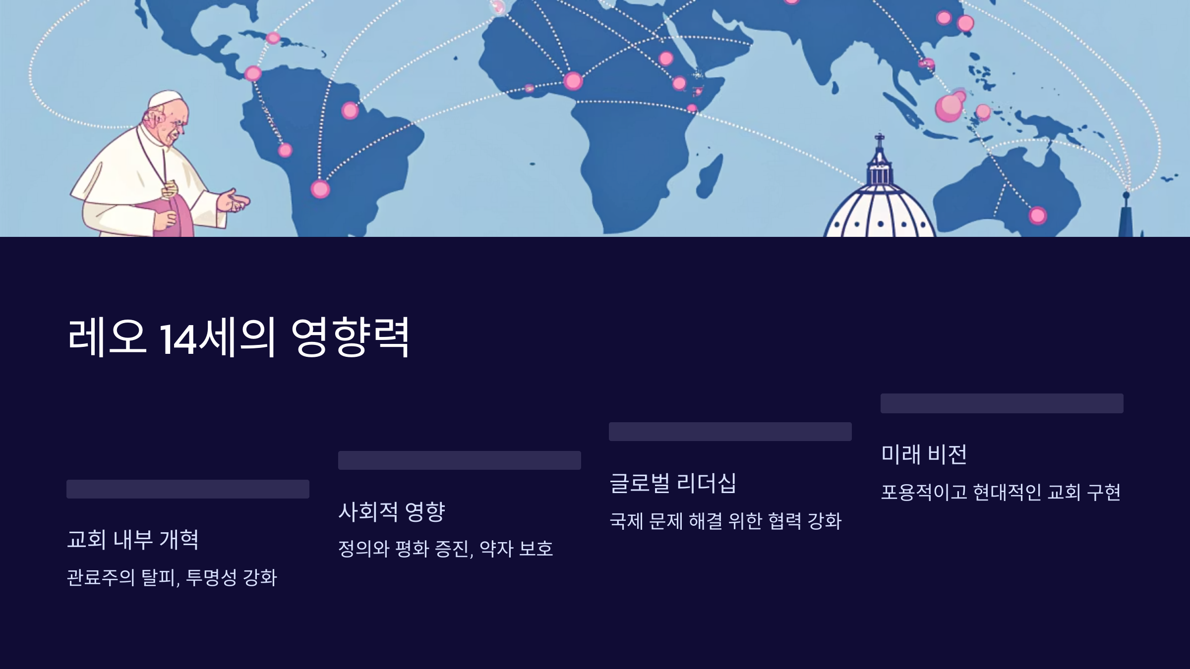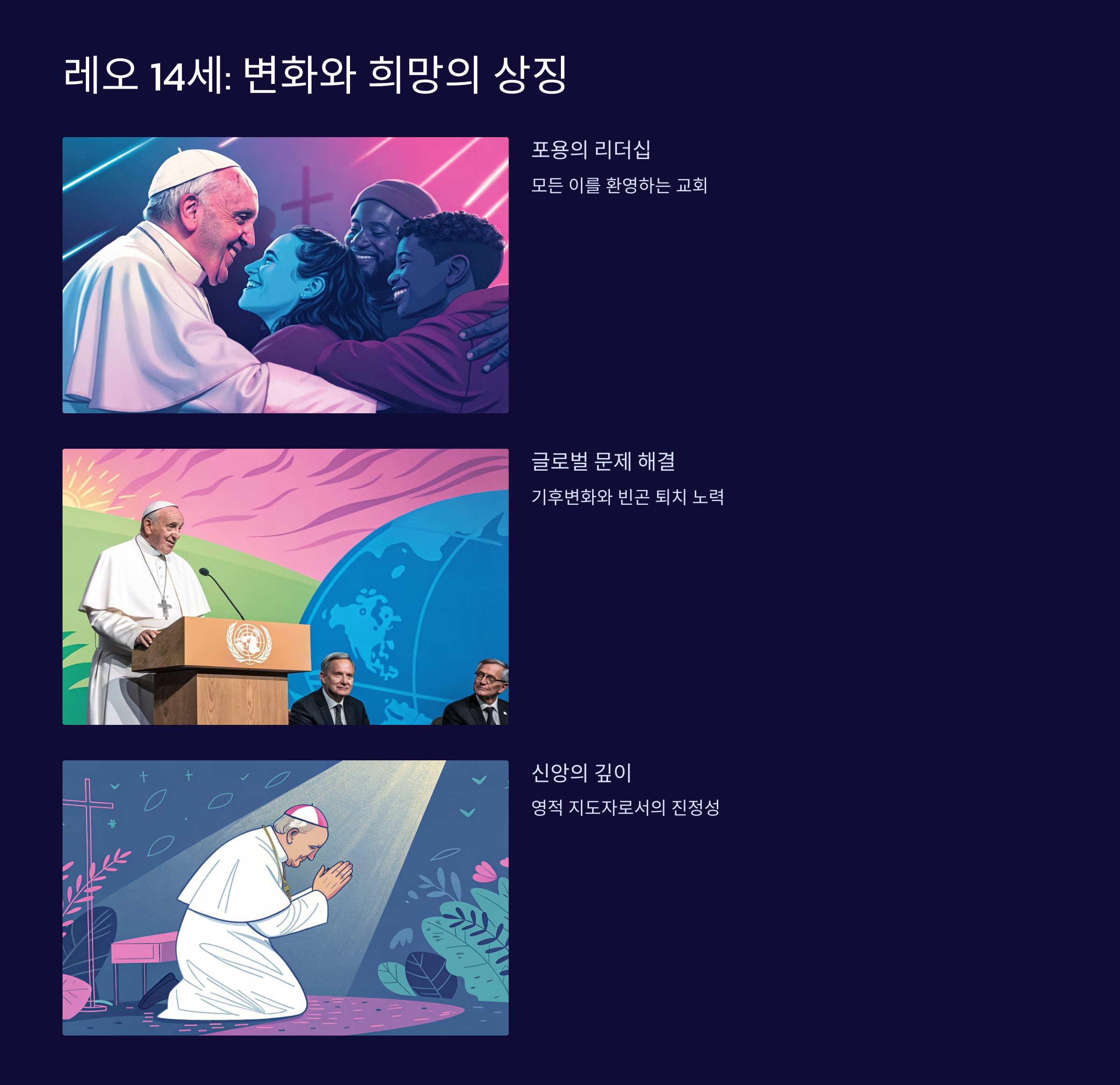 레오 14세는 이러한 다양한 이슈들에 대해 단순한 선언에 그치지 않고, 실제로 교회의 정책과 방향성을 바꾸기 위해 적극적으로 노력하고 있습니다. 이는 그가 단순히 전통을 지키는 것에 머무르지 않고, 현대 사회의 복잡한 문제를 해결하기 위해 실질적인 변화를 추구하는 지도자임을 보여주는 중요한 부분입니다.