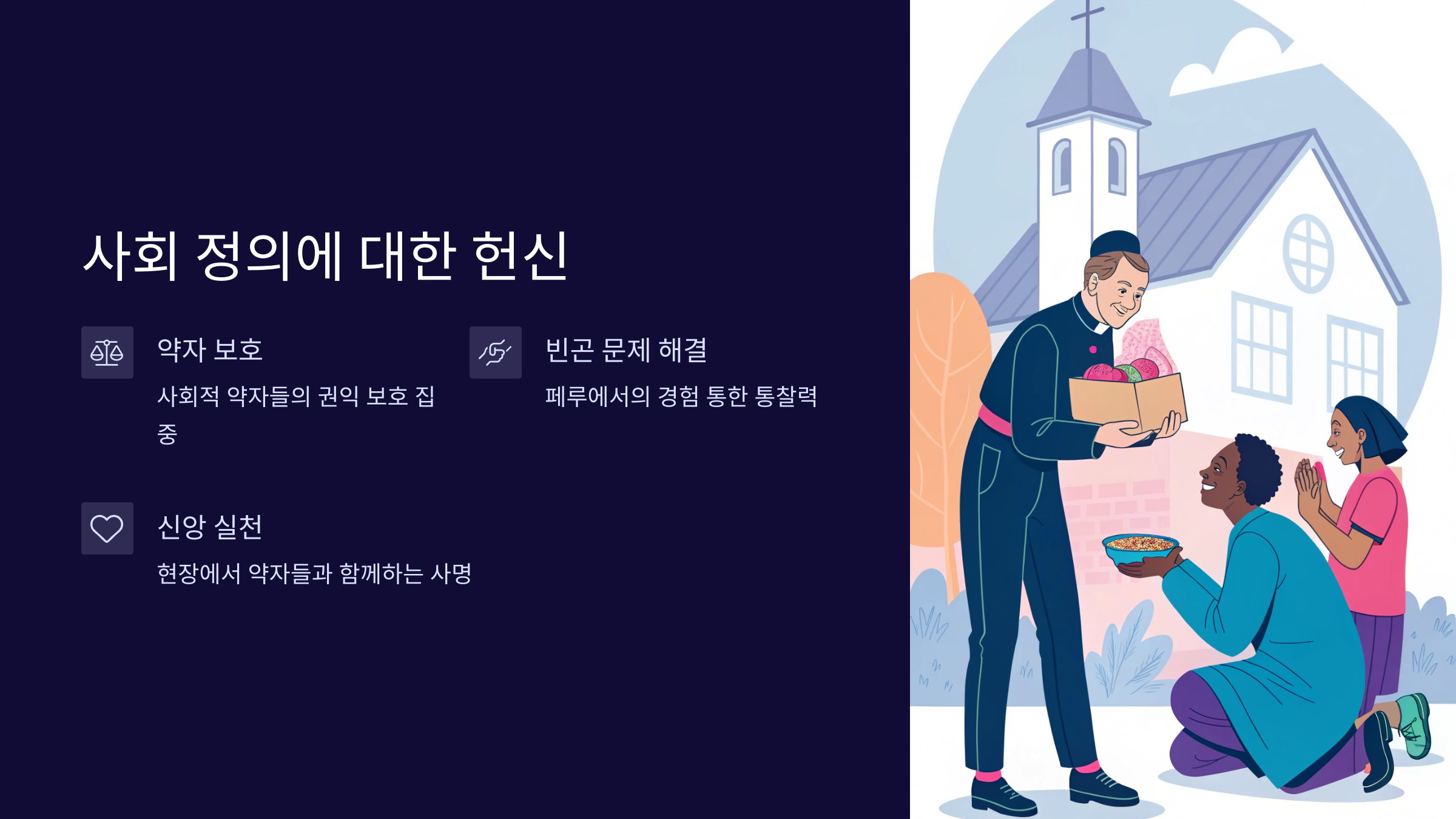 A5. 그는 페루에서 약 20년간 선교 활동을 하며, 사회적 약자들과 함께 생활한 경험이 있습니다. 이는 그의 목회적 접근과 신학적 성향을 형성하는 데 큰 영향을 미쳤습니다.
