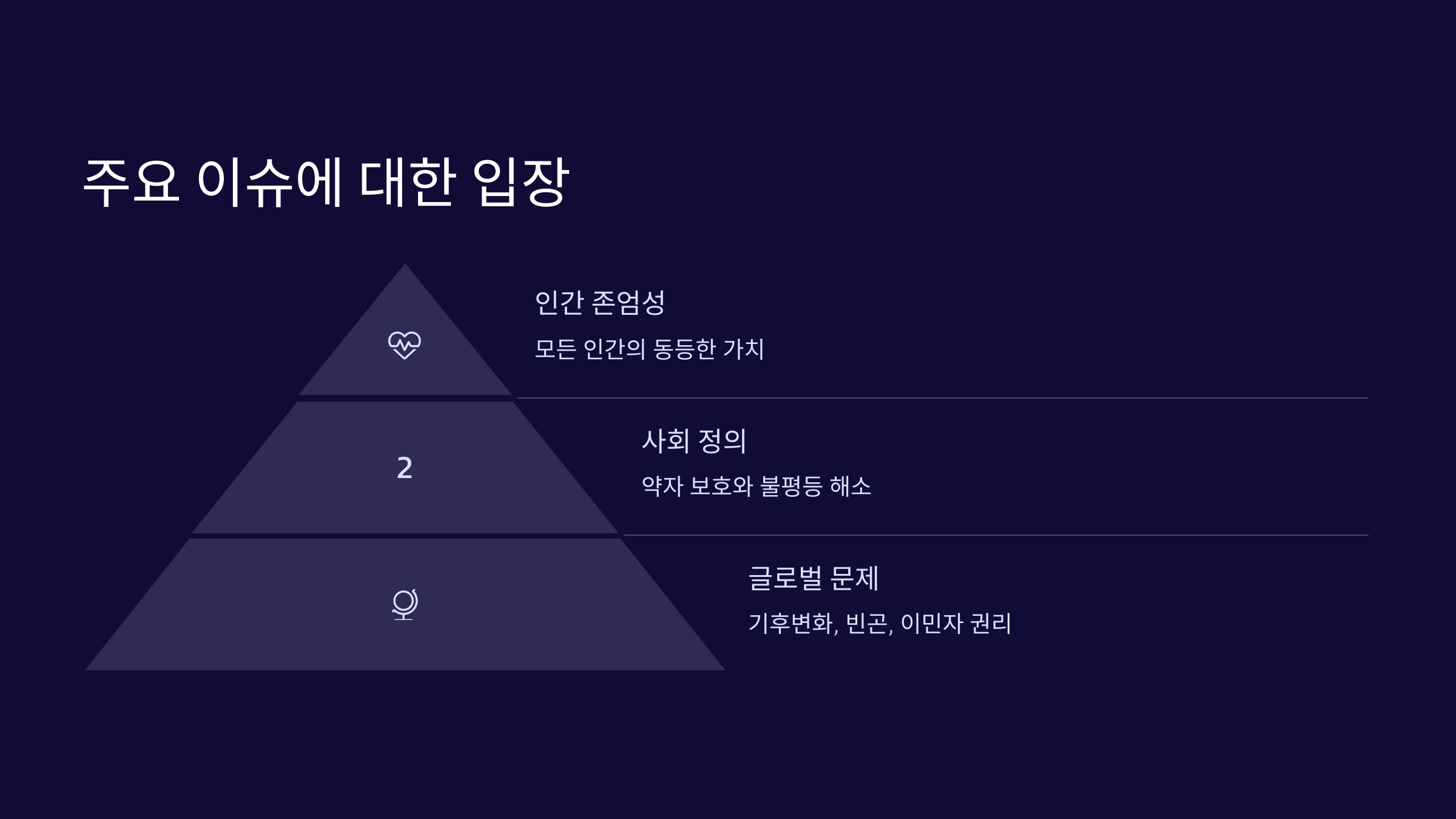 레오 14세 교황은 여러 현대적 이슈에 대해 분명한 입장을 가지고 있어요. 그는 단순히 종교적 가르침에 머무르지 않고, 사회 정의와 약자 보호를 강조하는 지도자로 평가받고 있습니다. 특히, 교황으로서의 초기 연설에서 "모든 인간은 동등한 존엄성을 가지며, 누구도 소외되어서는 안 된다"는 메시지를 강조했습니다. 이는 그의 사목적 철학이 반영된 부분으로, 전통적인 교회의 경계를 넘어서는 개혁적 시각을 보여주는 중요한 사례입니다.