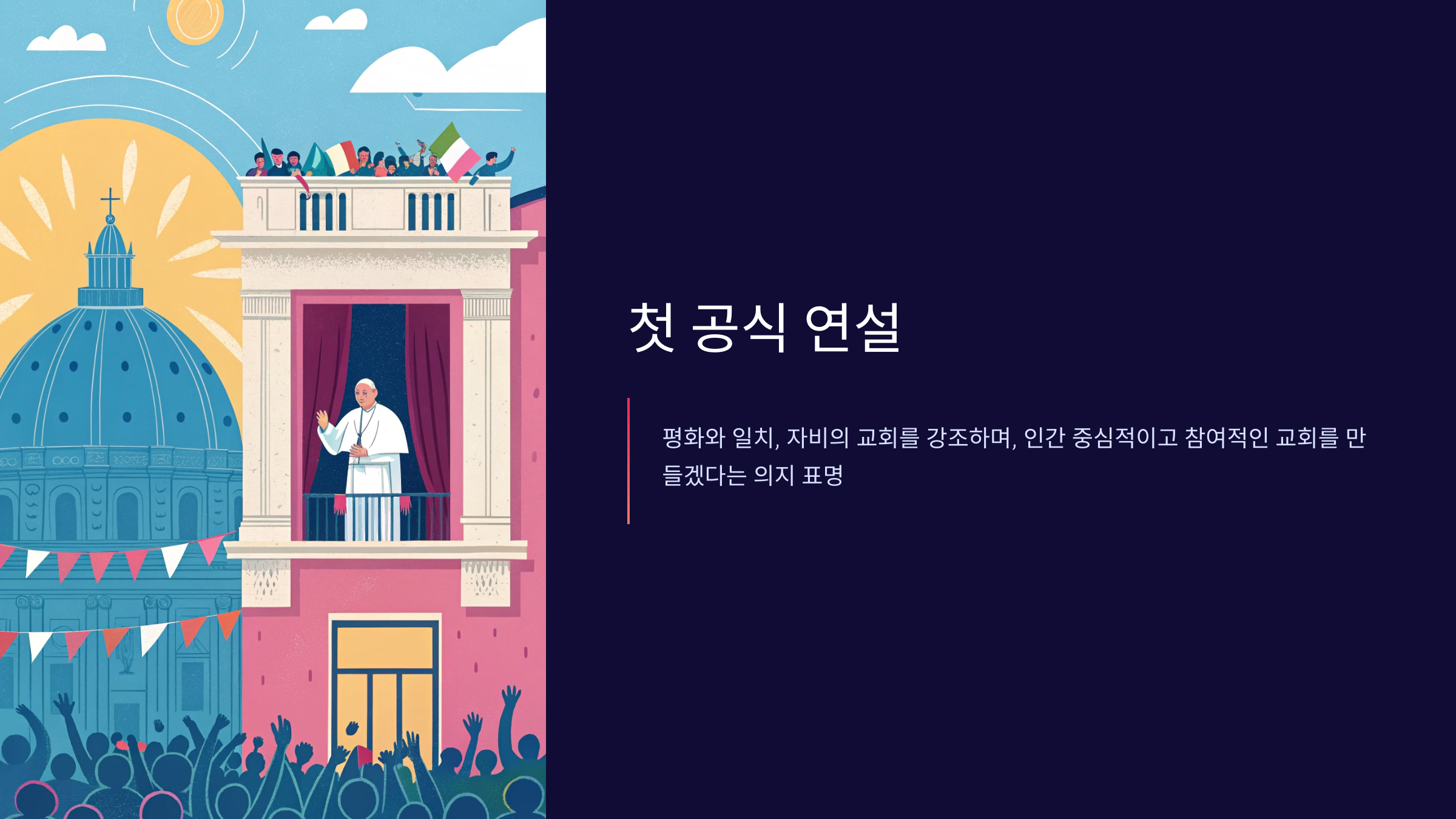 그는 첫 공식 연설에서 "평화와 일치, 자비의 교회"를 강조하며, 기존의 관료적이고 권위적인 교회 구조를 넘어 보다 인간 중심적이고 참여적인 교회를 만들겠다는 의지를 표명했습니다. 이는 많은 가톨릭 신자들에게 큰 희망을 주었으며, 특히 젊은 세대들에게는 교회가 단순히 전통에 머무르지 않고, 현대적 감각을 갖춘 살아있는 공동체로 변화할 수 있음을 보여주는 중요한 순간이었습니다.