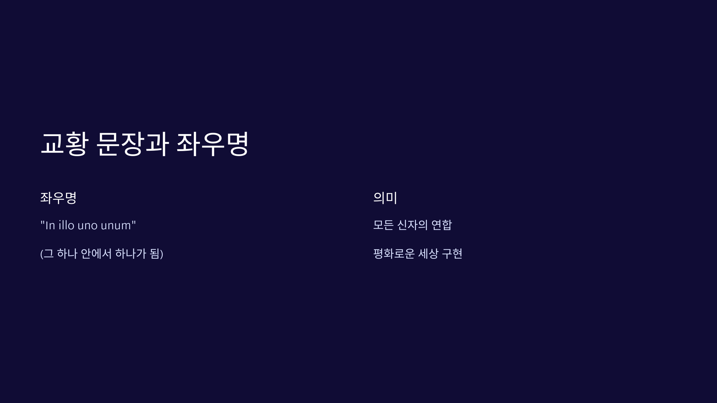 A7. 그의 좌우명은 **"In illo uno unum" (그 하나 안에서 하나가 됨)**으로, 이는 모든 신자가 하나로 연합하여 평화를 이루는 세상을 만들겠다는 그의 신념을 잘 보여줍니다.