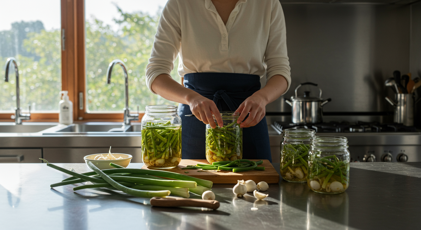 | 3단계: 병에 담기 | 소독된 유리병에 마늘쫑을 차곡차곡 담고, 기호에 따라 고추를 넣습니다. |