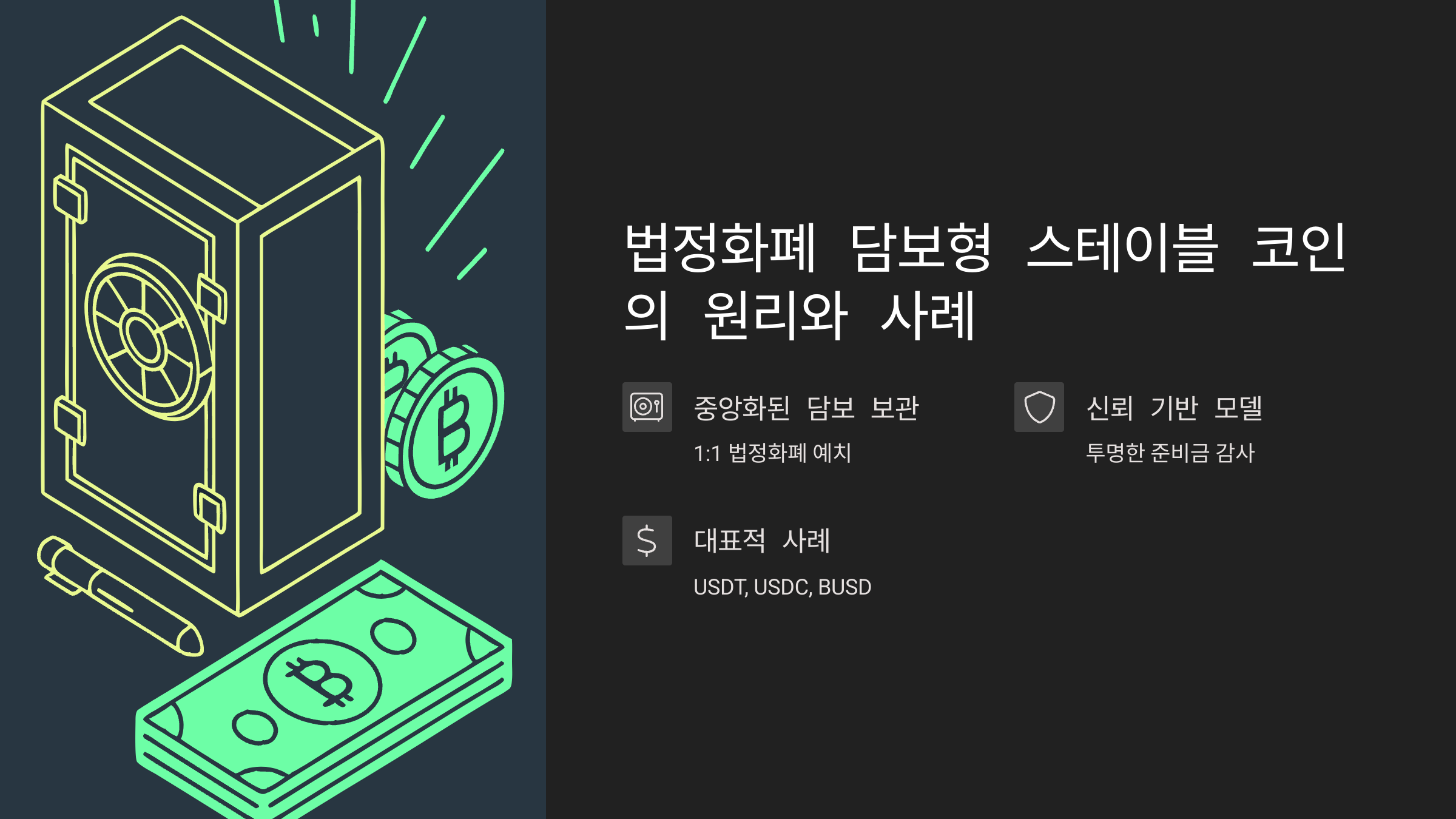| 법정화폐 담보형 | USD 등 법정화폐 | USDT, USDC, BUSD | 높은 안정성 | 준비금 투명성 문제 |