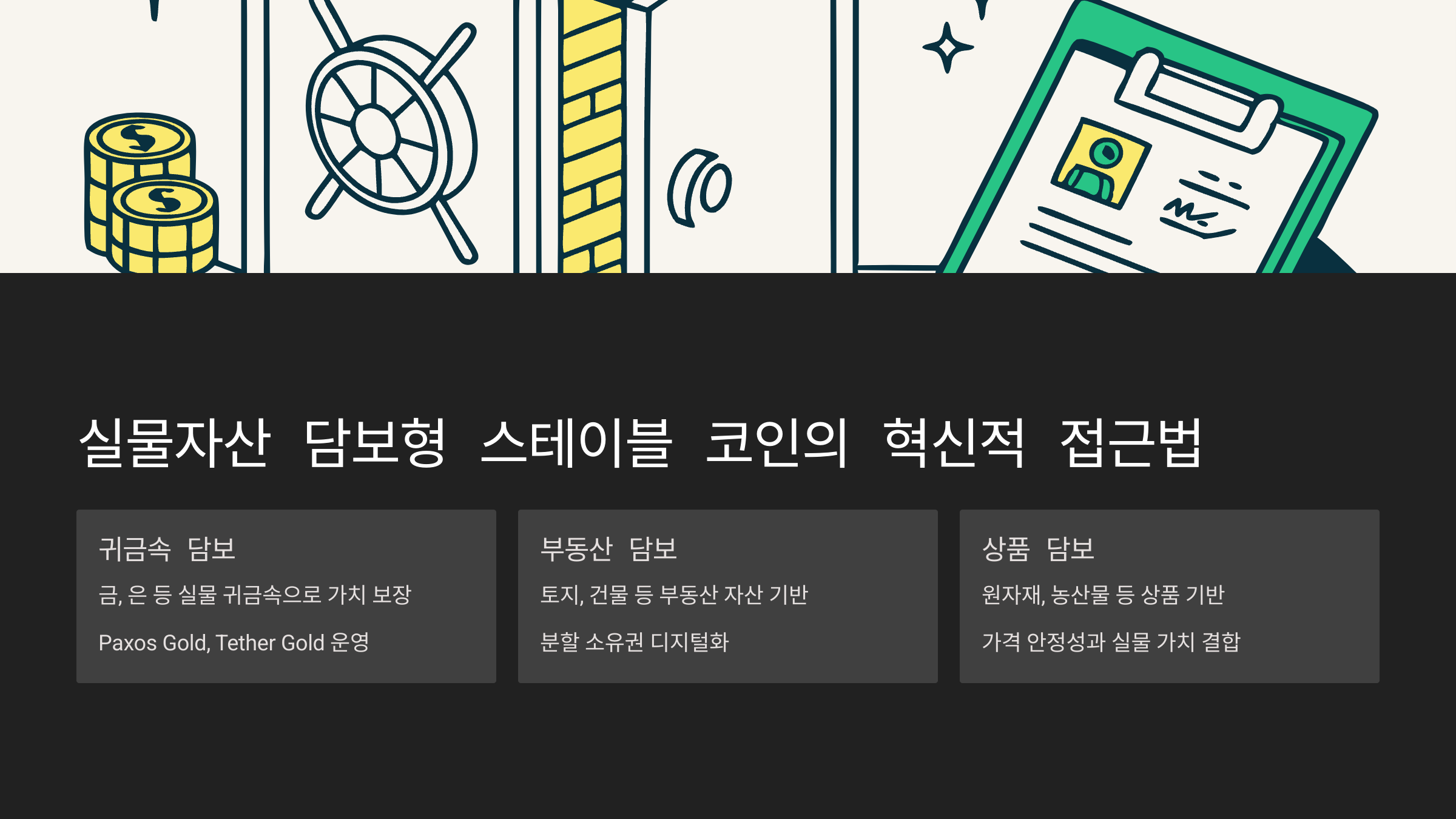 A5. 금이나 부동산을 실제 보관하며, 그 자산에 연동된 코인을 발행해요.