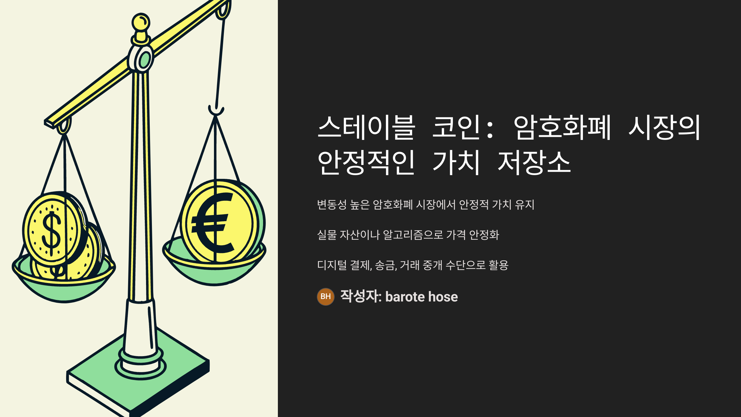 스테이블 코인은 암호화폐의 대표적인 변동성 문제를 해결하기 위해 고안된 가치 안정형 디지털 자산이에요. ‘stable’이라는 이름 그대로, 1코인 = 1달러 같은 방식으로 가격이 일정하게 유지되도록 설계되어 있어요.