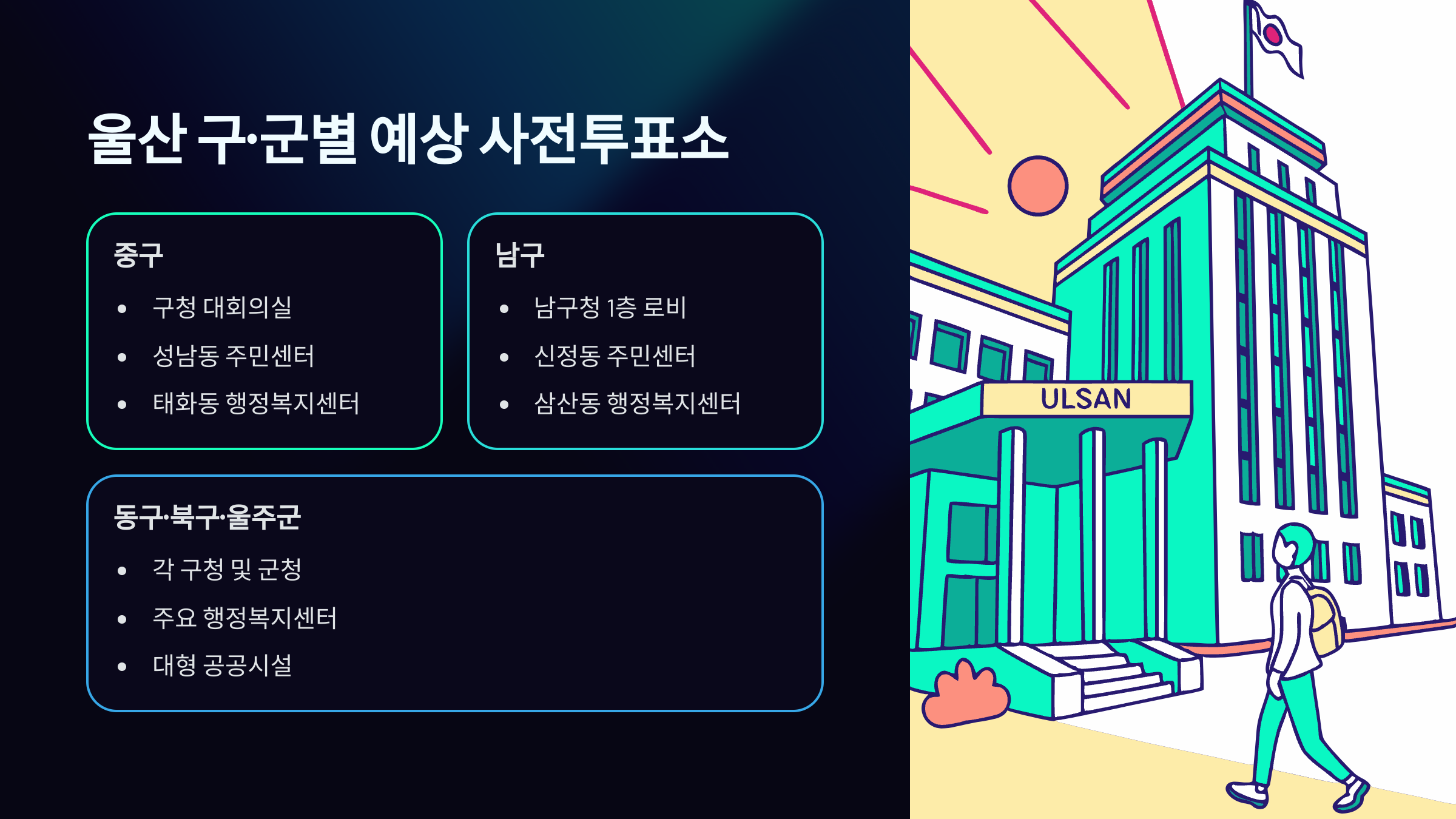 이제부터 울산 사전투표소 찾는 방법부터 예상 위치, 투표 시 유의사항까지 하나씩 안내해드릴게요!