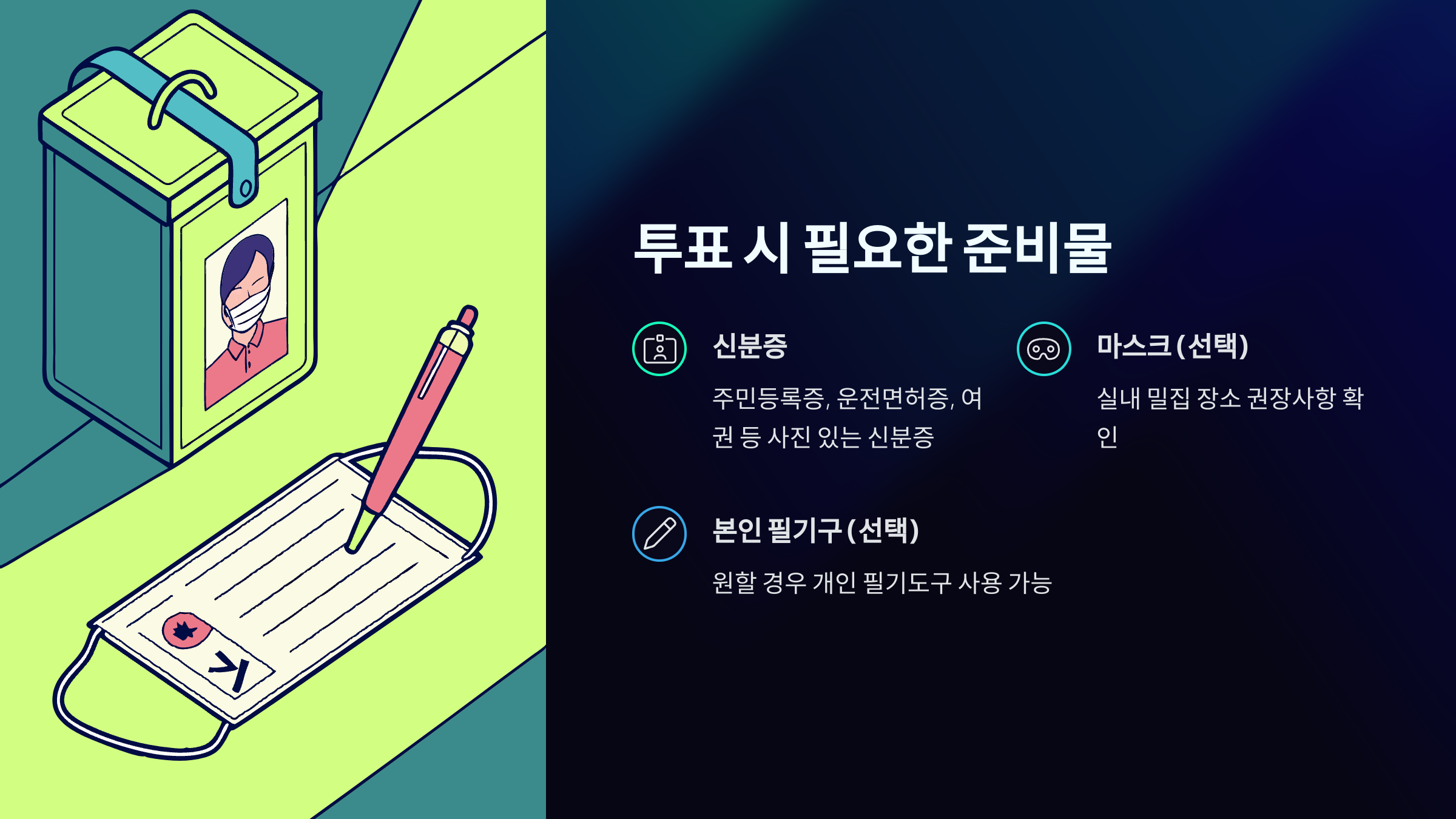 신분증 없이는 절대 투표가 불가능해요! 주민등록증, 운전면허증, 여권 등 실물로 준비해 주세요.