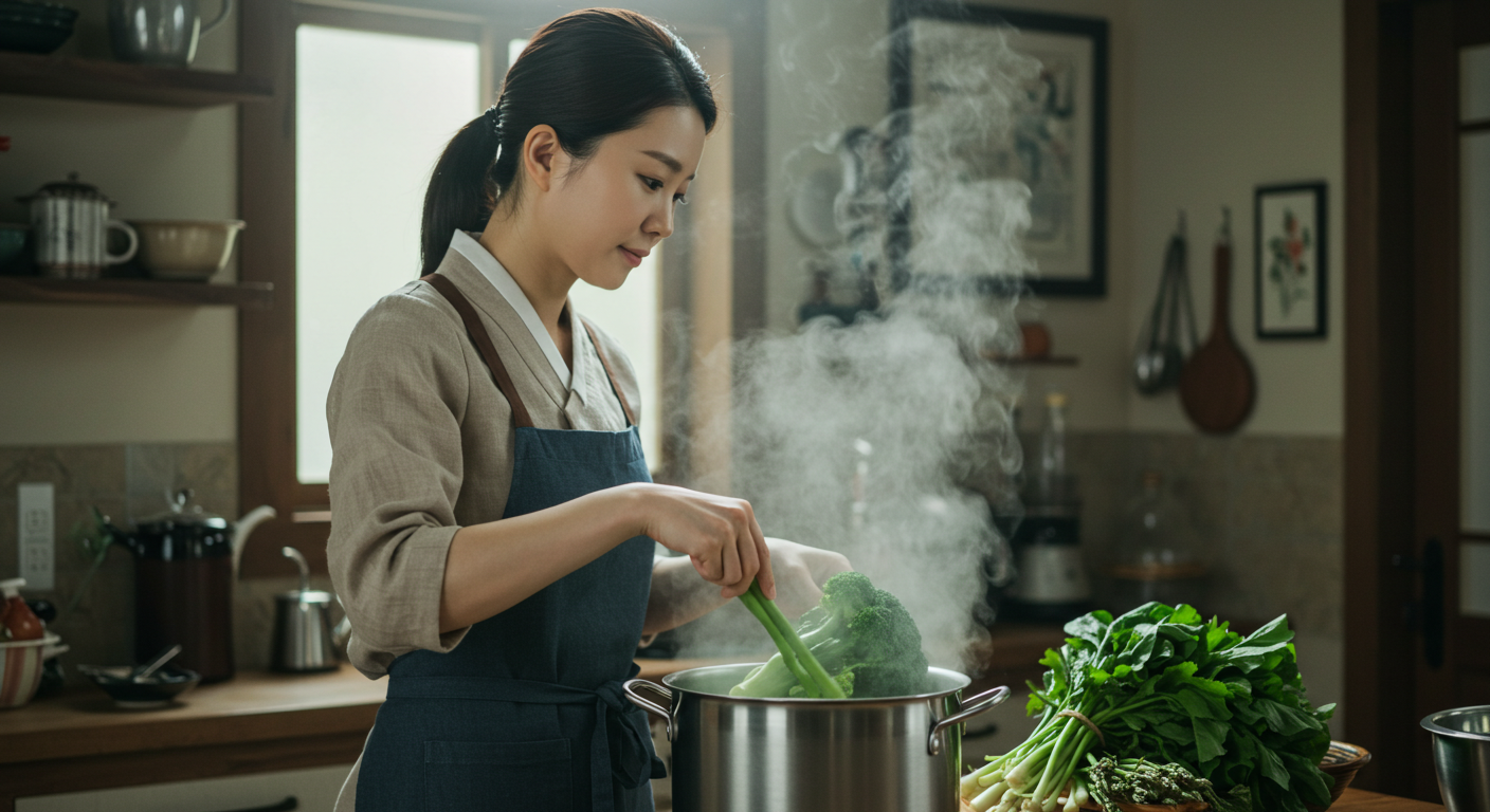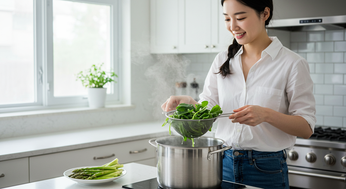 냄비에 물을 넉넉히 붓고 굵은소금을 0.5큰술 정도 넣어 끓여주세요. 물이 팔팔 끓으면 손질해 둔 눈개승마를 넣어 데칩니다. 여기서 중요한 포인트! 굵은 줄기 부분부터 먼저 넣고 10~15초 정도 데친 후, 전체를 넣고 50초에서 1분 정도 더 데쳐주세요. 너무 오래 데치면 물러지니 주의하세요! 데친 눈개승마는 바로 찬물에 넣어 열기를 식히고, 물기를 꼭 짜줍니다. 이렇게 해야 쫄깃한 식감을 살릴 수 있어요.
