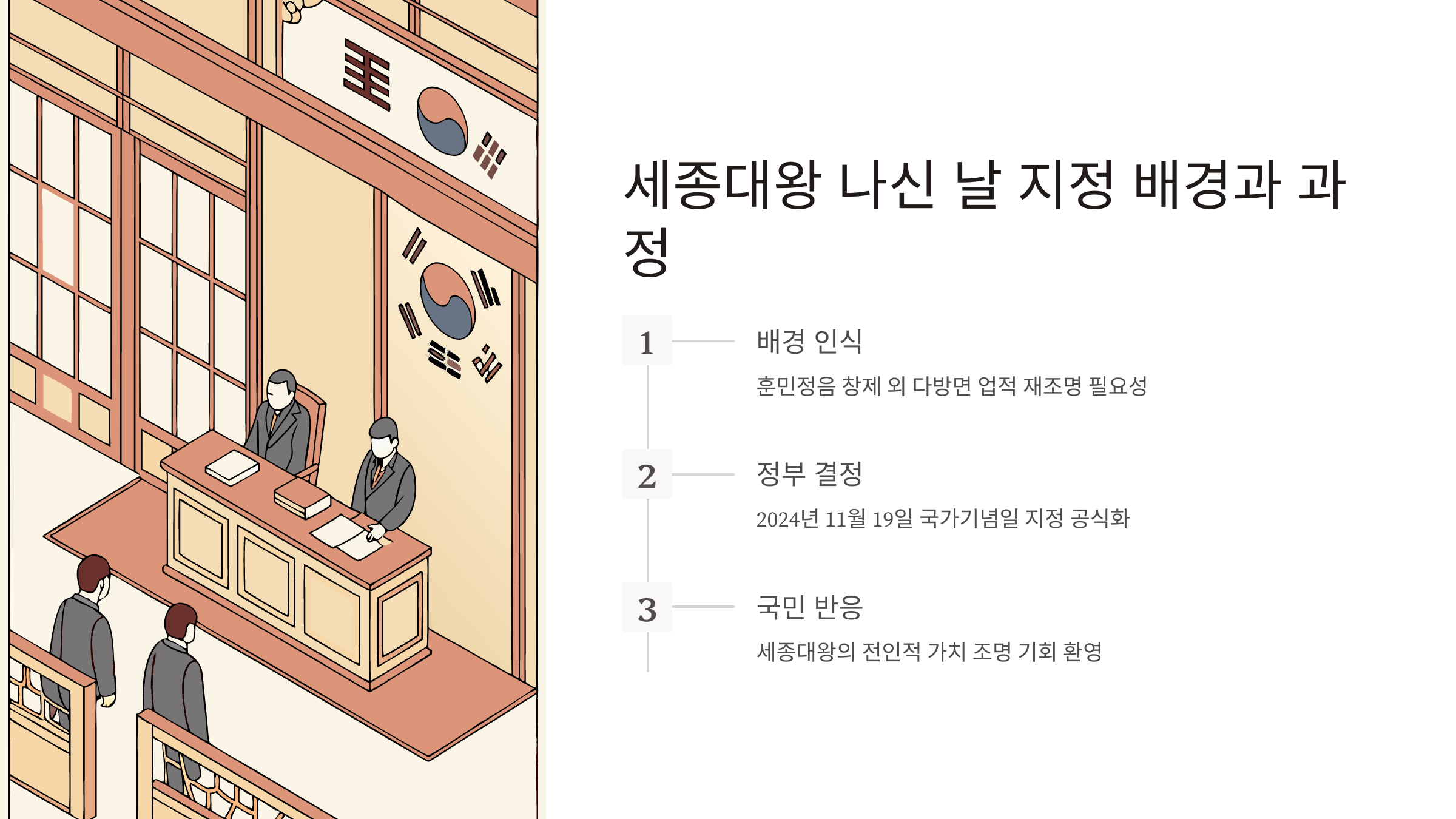 2024년 11월 19일, 대한민국 정부는 세종대왕 탄신일인 5월 15일을 '세종대왕 나신 날'로 국가기념일로 지정했어요.