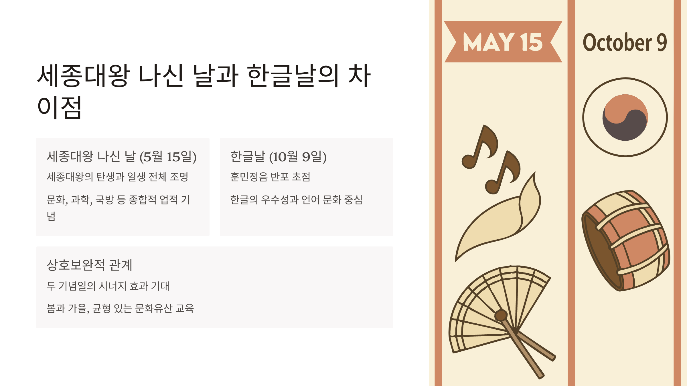세종대왕 나신 날과 한글날은 비슷해 보이지만, 기념의 초점, 법적 지위, 지정 이유 등에서 분명한 차이가 있어요. 쉽게 말해, 한글날은 ‘문자 탄생’을 중심으로 한 기념일이고, 세종대왕 나신 날은 ‘인물 중심’의 기념일이라고 볼 수 있죠.
