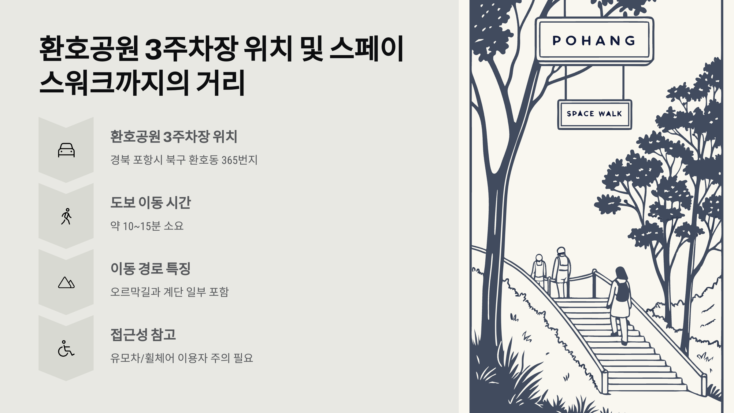 공원 내부 산책로를 따라 이동하게 되며, 중간에 오르막길과 계단이 포함되어 있으므로 유모차나 휠체어 이용자분들은 약간의 주의가 필요해요.