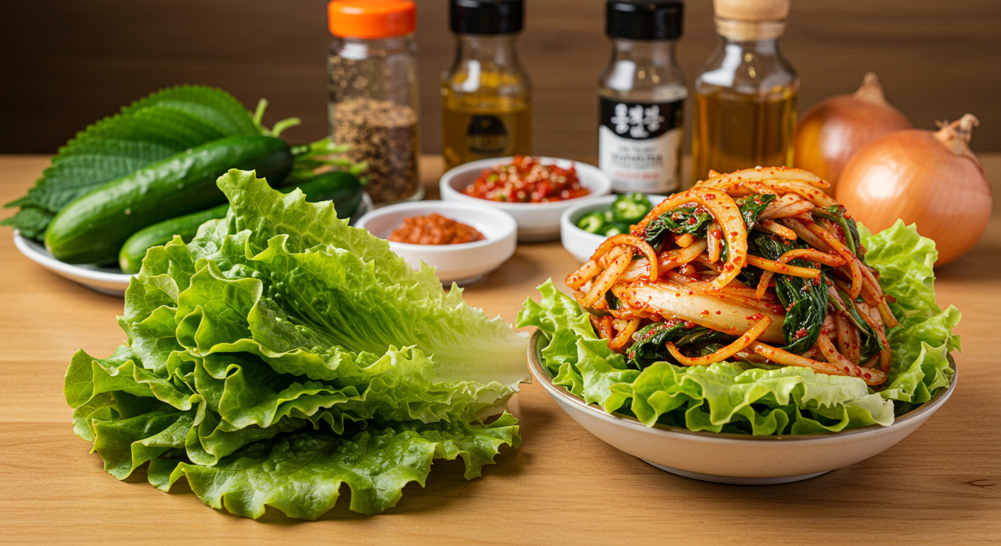 가장 중요한 재료는 당연히 상추겠죠? 상추는 싱싱하고 잎이 두껍지 않은 것을 고르는 게 좋아요. 이 외에도 아삭한 식감을 더해줄 오이와 양파, 그리고 향긋함을 더해줄 깻잎이나 부추를 소량 준비하면 훨씬 풍성한 맛을 낼 수 있어요.