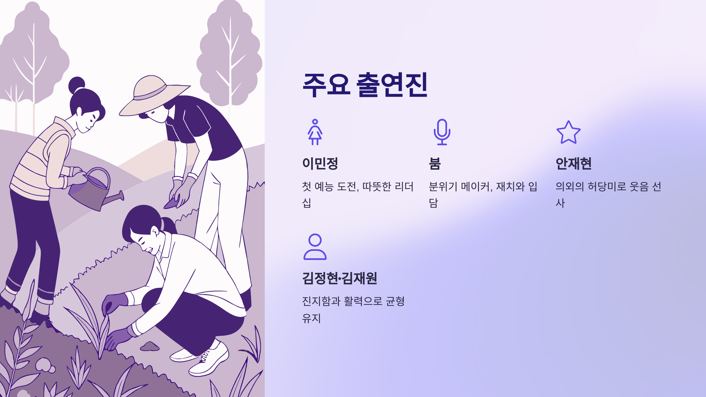 | 출연진 조합 | 다양한 캐릭터 매력 | 밸런스 좋음 |
