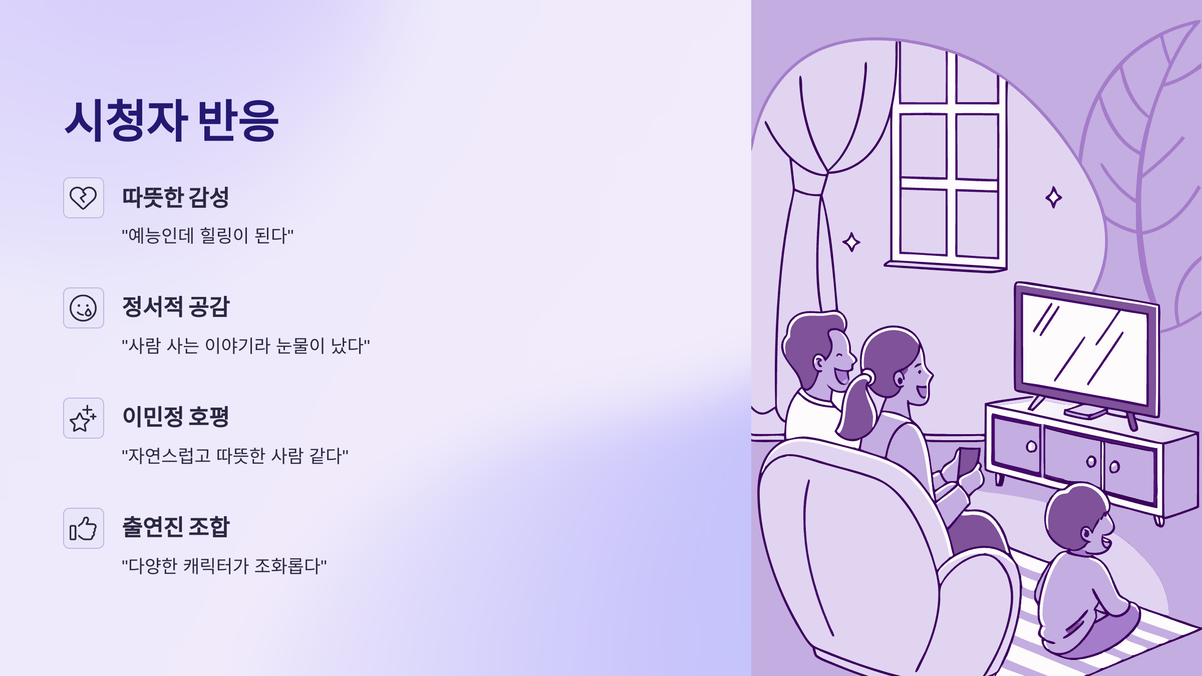 | 프로그램 분위기 | 힐링·따뜻함 중심 | 감동적이라는 평가 다수 |