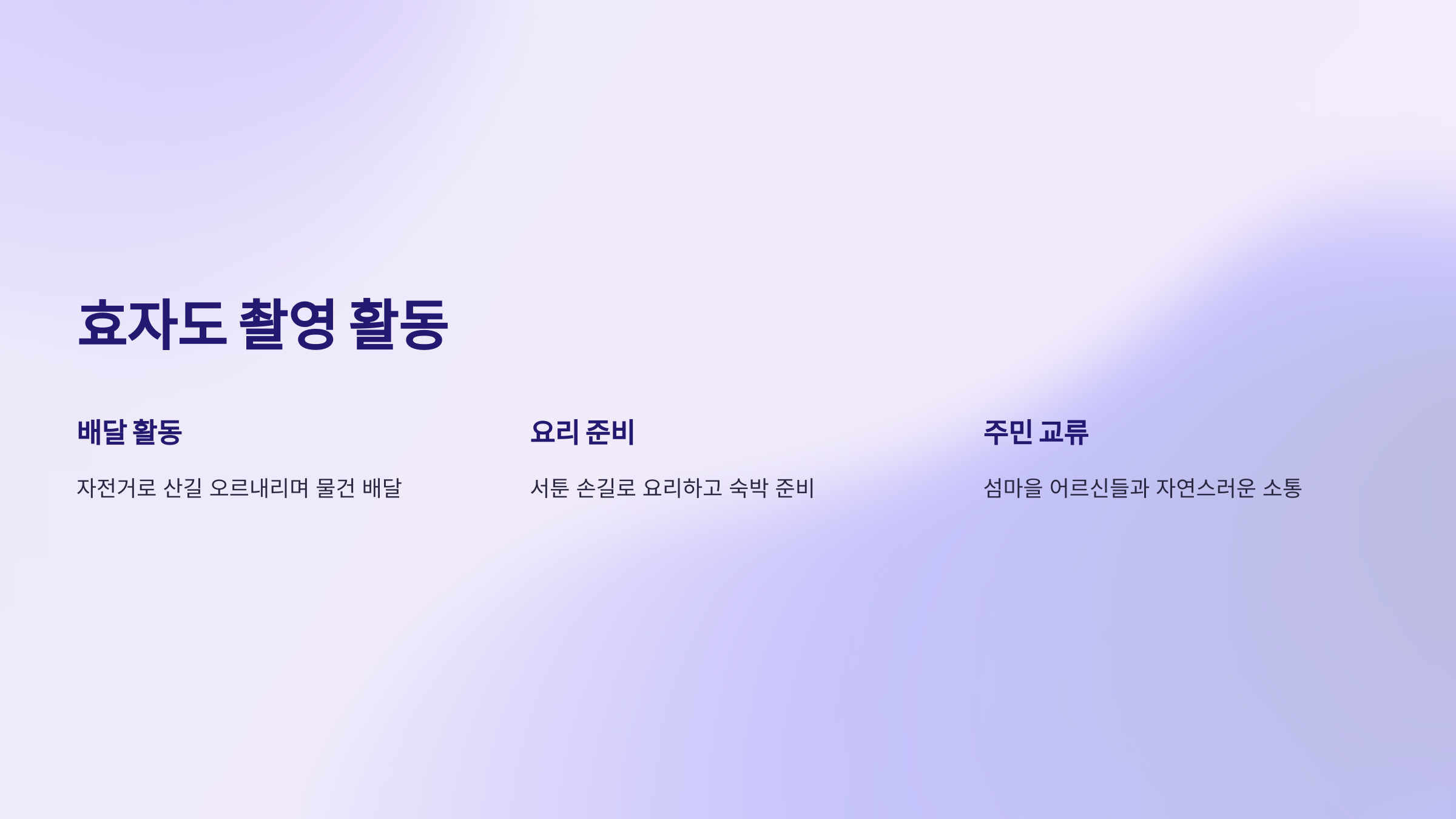 효자도는 교통이 불편하고, 상점도 거의 없는 지역이라 이런 방문은 실제 주민들에게도 큰 의미가 있었대요. 출연진이 자전거로 산길을 오르내리며 물건을 배달하고, 서툰 손길로 요리하고 숙박 준비를 하는 모습은 방송을 통해 잔잔한 감동을 주었답니다.