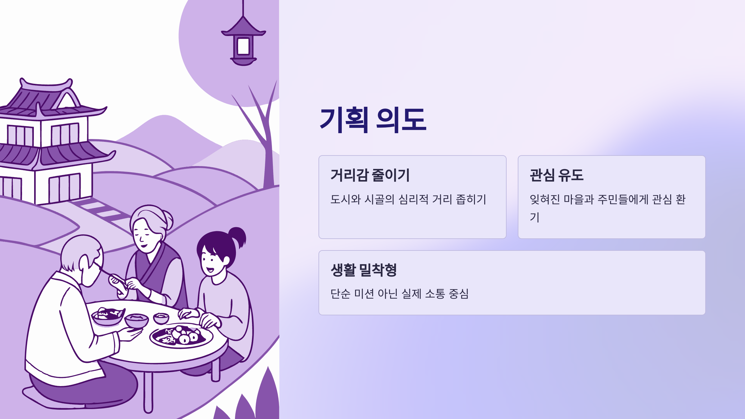 | 기획 방향 | 시골 방문 통한 정 나눔 | 관찰 예능 |