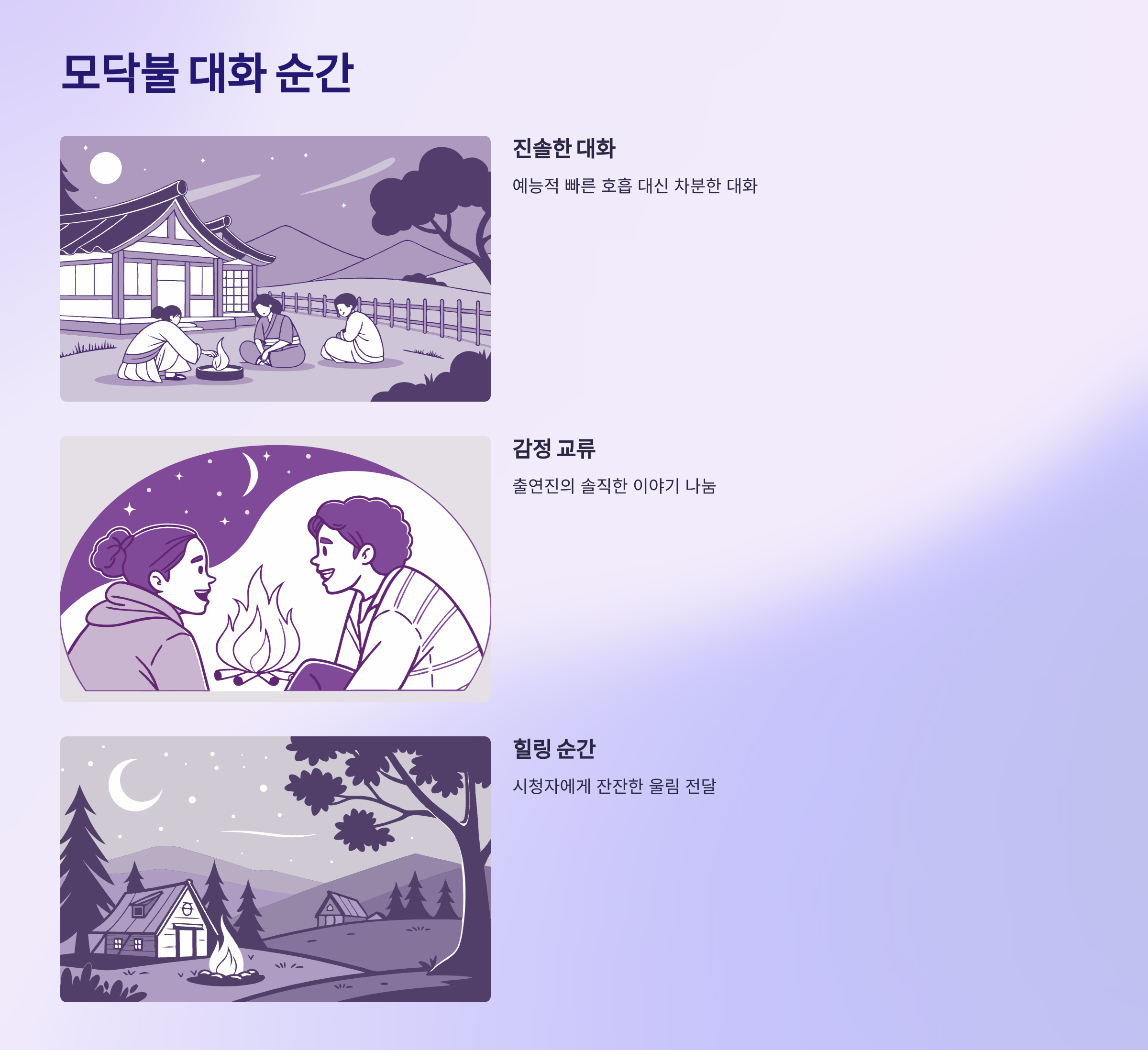 | 모닥불 대화 | 출연진의 솔직한 이야기 | 감동과 힐링 |