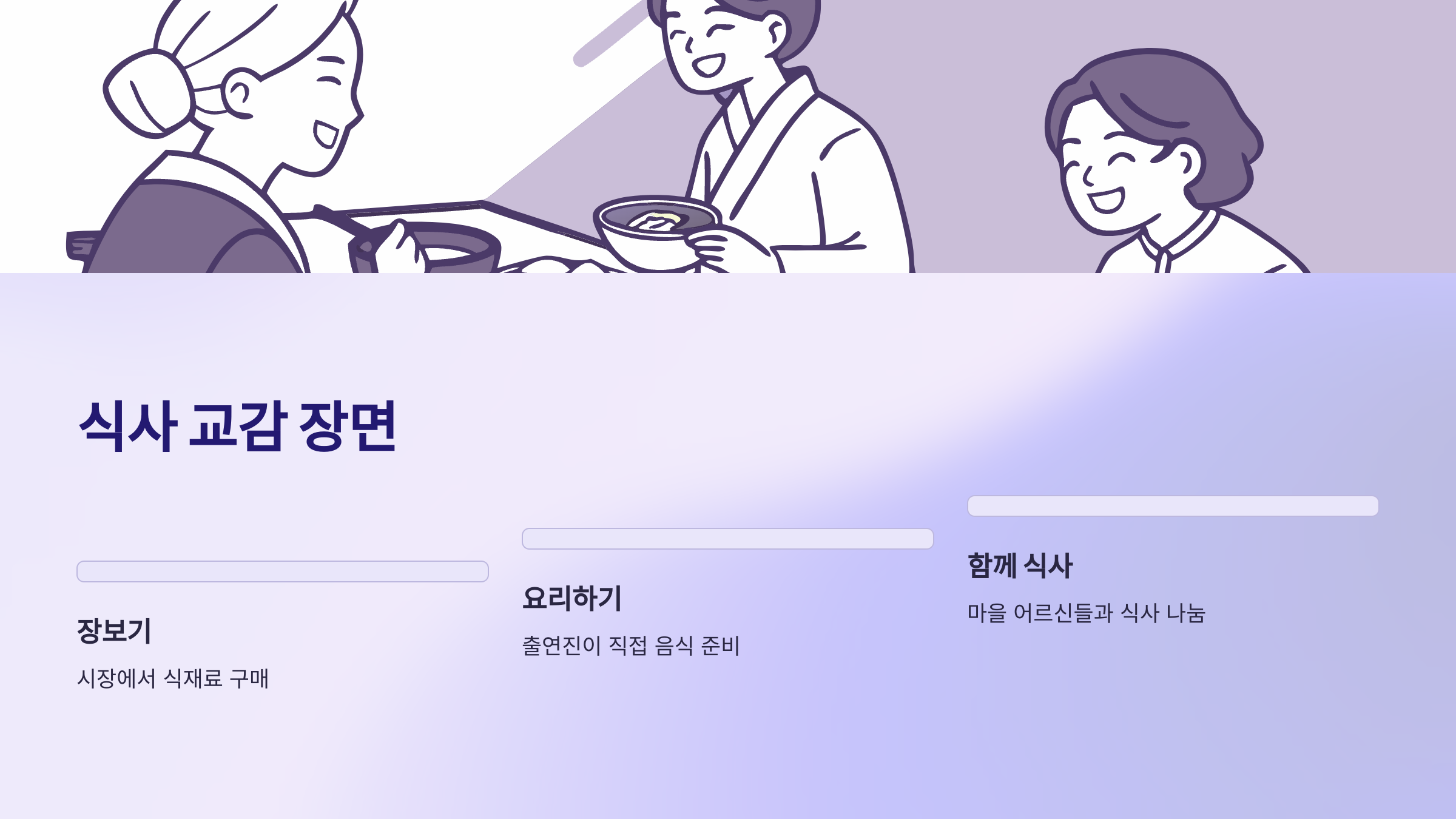 | 식사 교감 | 직접 요리 후 식사 나눔 | 정과 웃음 |