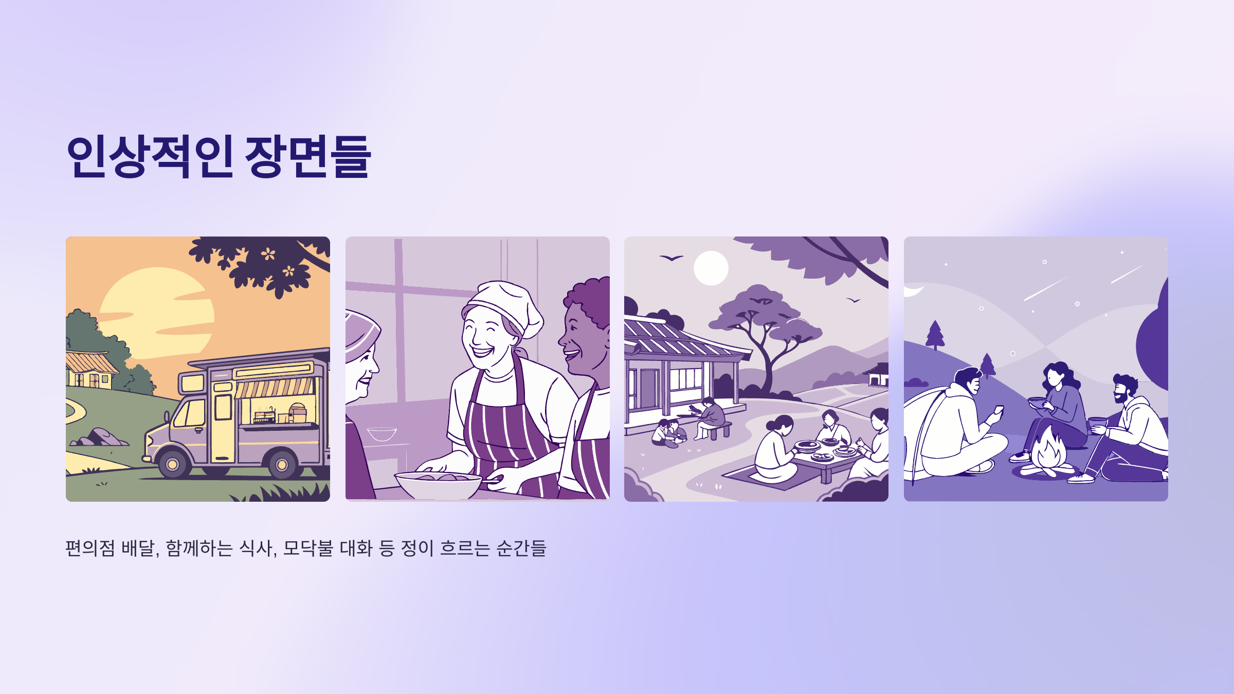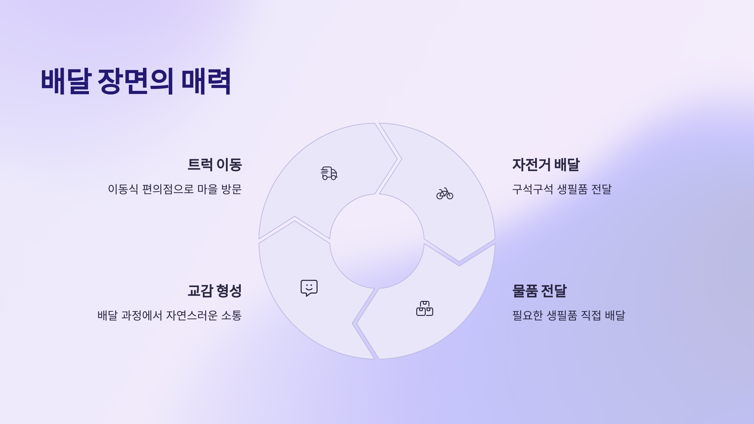 | 편의점 배달 | 트럭과 자전거로 물품 전달 | 현장감과 봉사 느낌 |