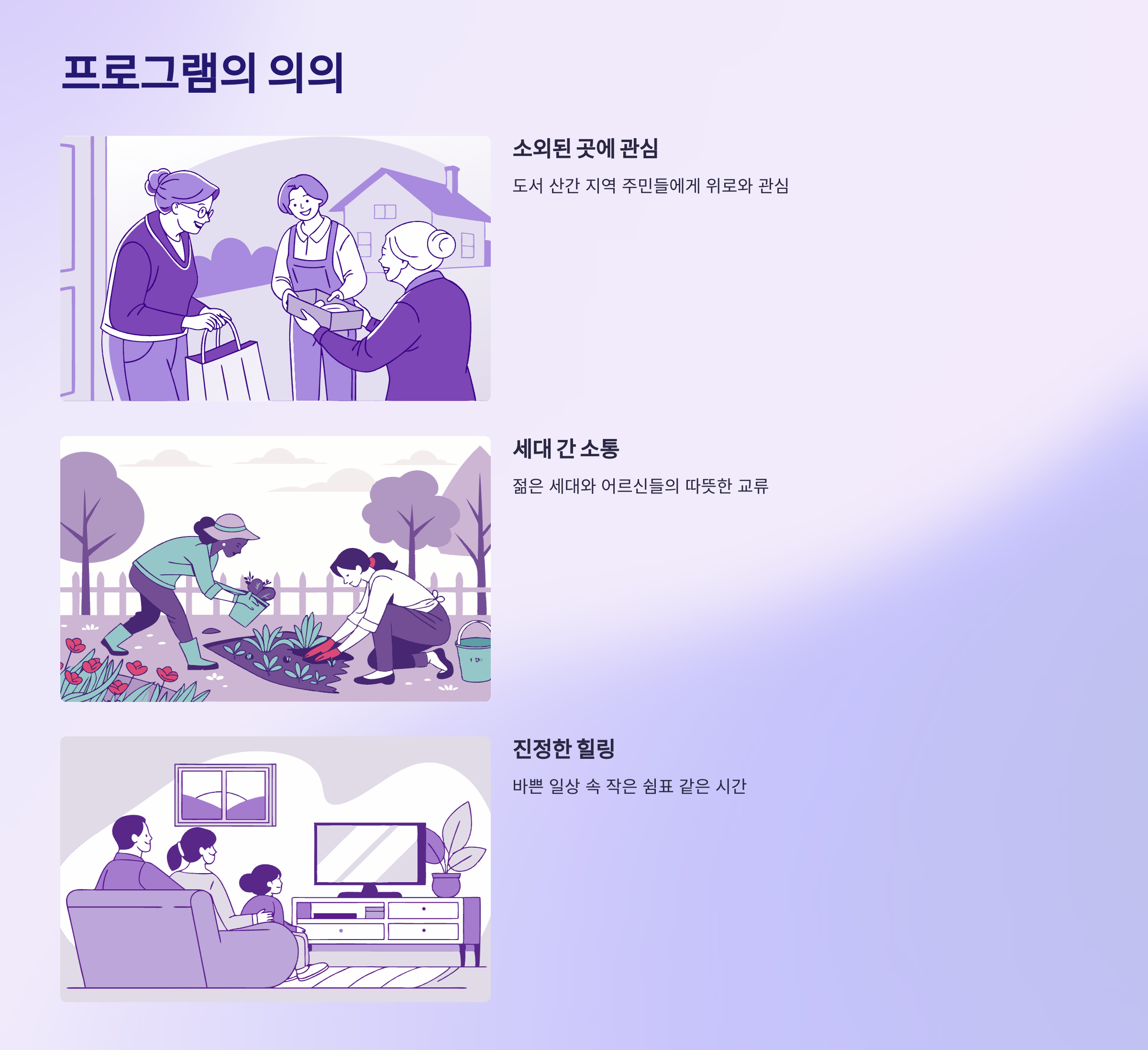 A1. 시골 마을이나 도서 산간 지역을 방문해 생필품을 전달하고 1박 2일을 함께 보내며 정을 나누는 힐링 예능이에요.
