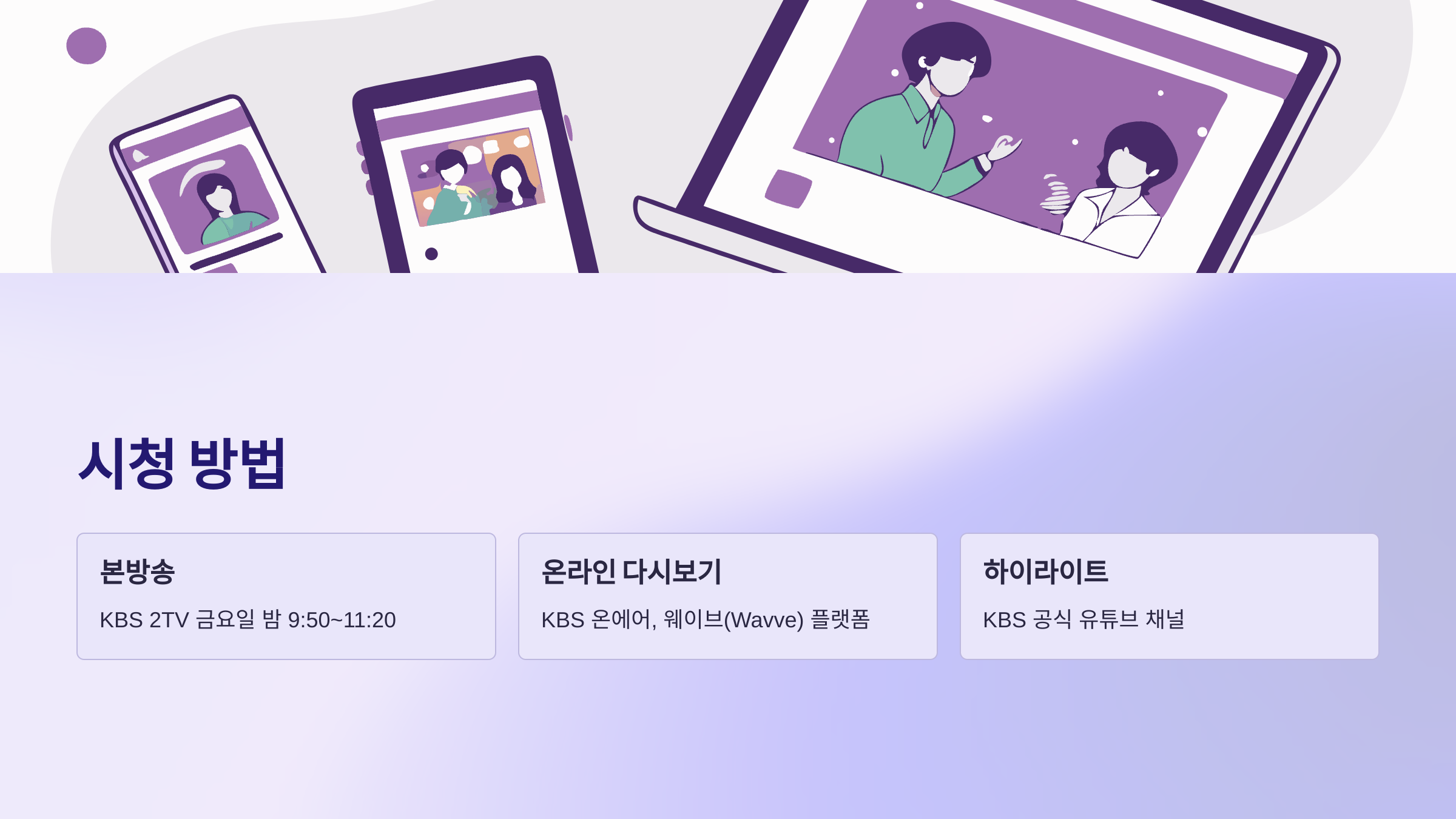 방송은 본방 외에도 KBS 온에어, 웨이브(Wavve) 등 온라인 플랫폼을 통해 다시보기로 시청할 수 있어요. 예고편, 하이라이트 영상 등도 KBS 공식 유튜브 채널에서 확인할 수 있어요.