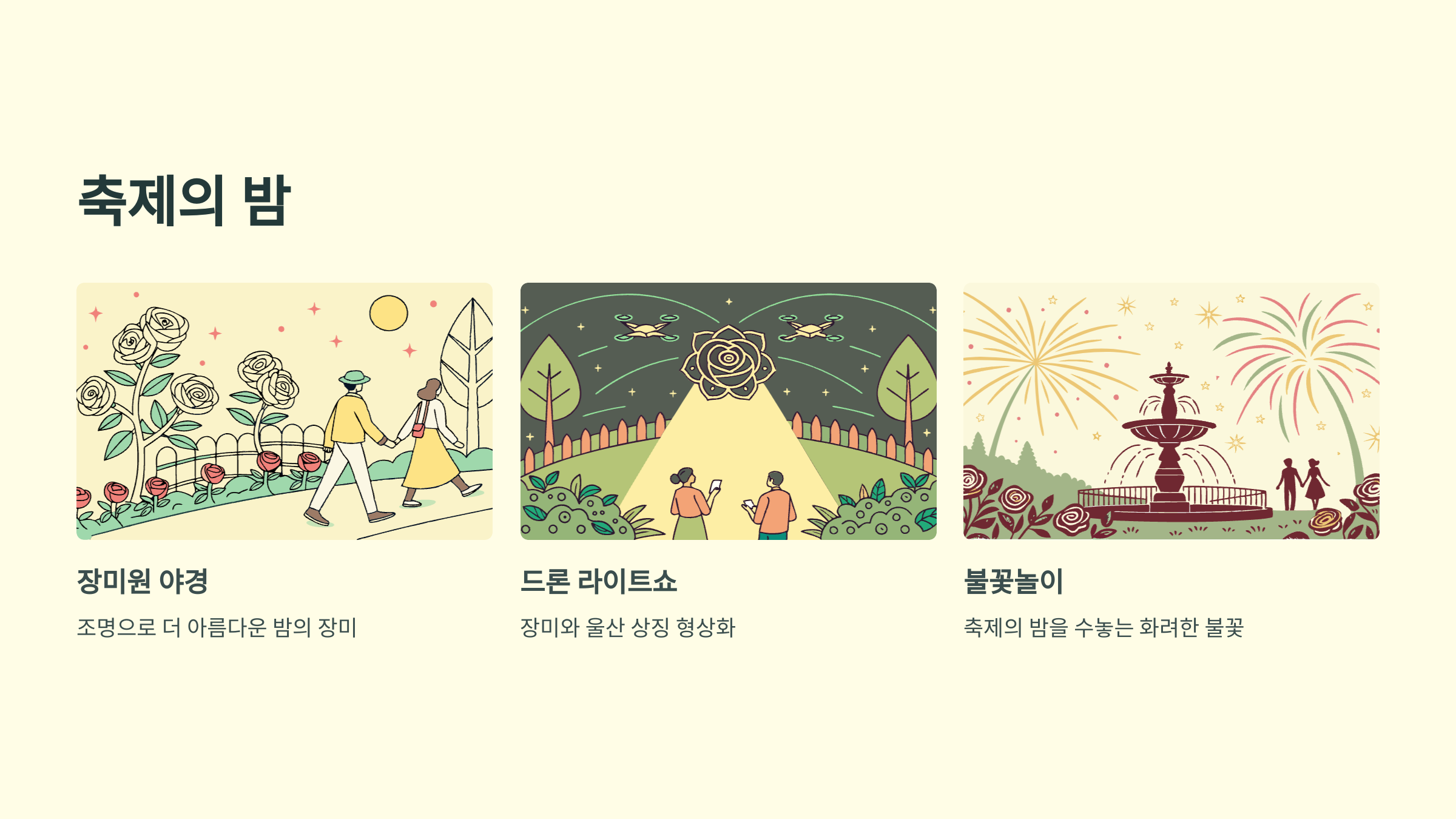 A3. 개막식, 로즈밸리 콘서트, 불꽃놀이, 드론 라이트쇼, 장미 체험 부스 등이 대표 콘텐츠예요.