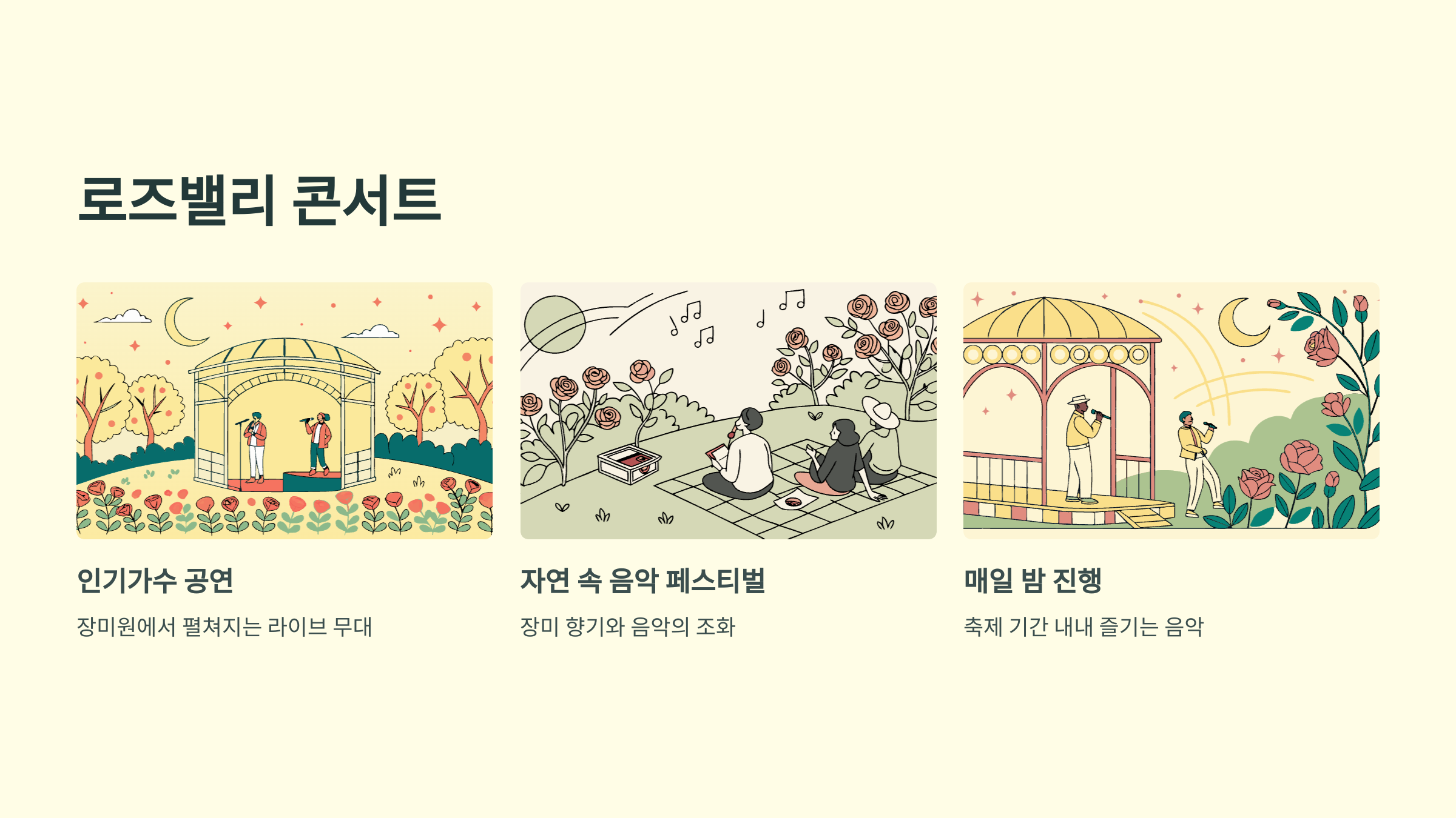 둘째, 로즈밸리 콘서트는 축제의 음악적 하이라이트예요. 매년 인기가수들이 무대에 올라 장미 정원에서 라이브 무대를 선사하며, 마치 자연 속 음악 페스티벌 같은 느낌을 주는 공연이에요.