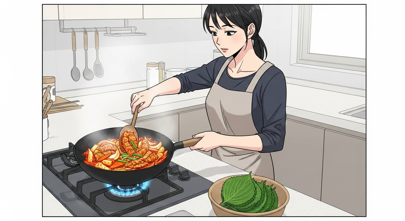 깻잎은 향긋한 풍미를 더해주는 좋은 채소지만, 너무 일찍 넣으면 물이 생기고 향이 날아가요. 불을 끄기 직전에 넣어 잔열로 살짝 숨만 죽여주면 아삭함과 향을 동시에 살릴 수 있습니다.