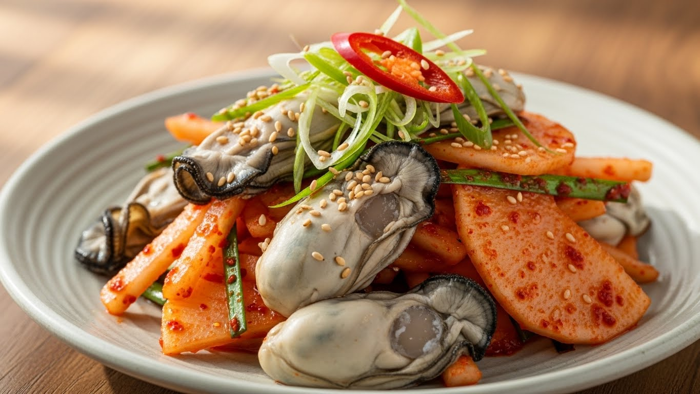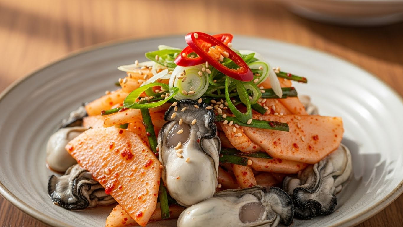 겨울철 식탁의 꽃이라고 할 수 있는 굴은 맛뿐만 아니라 영양학적으로도 매우 훌륭한 식재료예요. 특히 11월부터 2월까지가 제철인 굴은 글리코겐 함량이 높아져 가장 맛이 좋고 탱글탱글한 식감을 자랑한답니다. 여기에 소화를 돕는 천연 소화제인 무를 더하면 맛의 균형은 물론 건강까지 챙길 수 있는 완벽한 조합이 탄생해요. 무의 아삭한 식감과 굴의 부드러움이 어우러져 씹는 재미까지 더해주니 겨울철 필수 반찬이라 할 수 있죠.